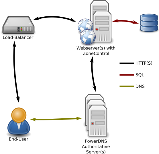 The reference architecture for ZoneControl consists of one or more webservers running ZoneControl, fronted by a Load-Balancer. These ZoneControl-instances use one shared database for their configuration and communicate with the API of one or more PowerDNS Authoritative Servers.